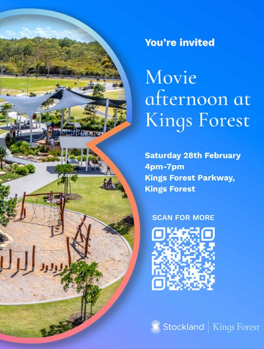 To mark this next phase, Stockland will host a free movie afternoon on Saturday, 28 February, from 4 pm to 7 pm at Kings Forest Parkway.
