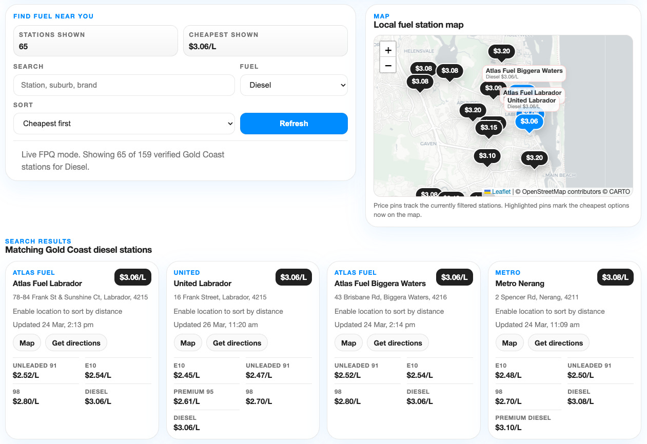 The tool covers every service station across the Gold Coast local government area and lets users search by suburb or station, sort by the cheapest fuel, and view nearby prices on a map.