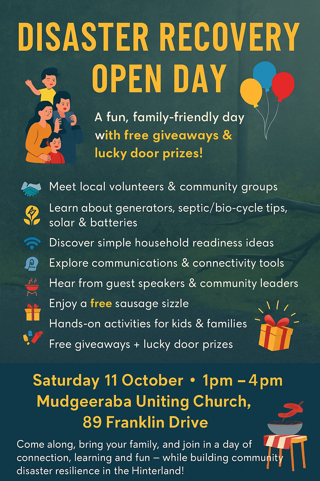 The resilience drive kicks off at Mudgeeraba Uniting Church (89 Franklin Drive) on Saturday 11 October 1pm-4pm, where there will be a range of stalls and short talks about generators, solar, battery storage, septic systems, communications, relief hubs, and more. The Mudgeeraba Lions will host a free sausage sizzle, there will be face painting for kids, and practical disaster-ready giveaways at the door.