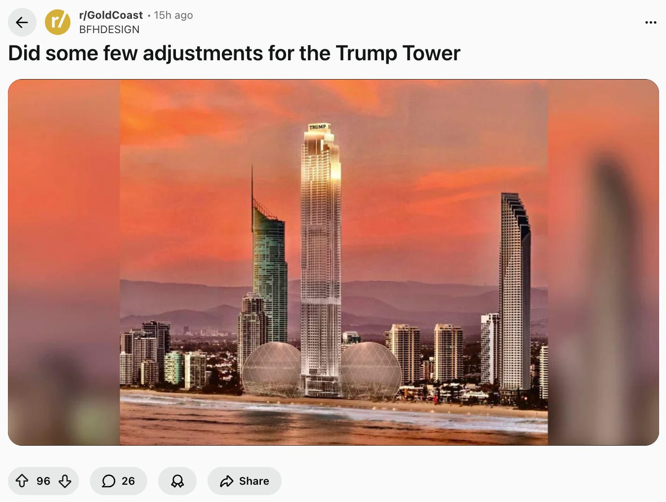 What’s Happening: The Gold Coast looks set to get its own Trump Tower in a move that will divide the community, with President Trump’s son Eric confirming on social media that plans were well advanced to develop the Trump International Hotel & Tower Gold Coast on Trickett Street in Surfers Paradise.