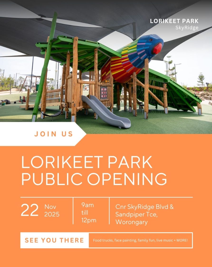 What’s Happening: SkyRidge’s green heart, the expansive Lorikeet Park, is officially opening to the public from 9 am this Saturday.